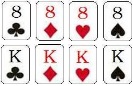 | A flopon ismersz már 5 lapot, a két sajátodat és a flop lapjait. A turnön tehát a fennmaradó általad ismeretlen 47 lap bármelyike kiosztásra kerülhet. Ha 8 lap segít ebből a 47 lapból, hogy kiegészítsd a húzódat, tehát segítőkész, míg 47-8=39 lap nem teszi ezt meg, vagyis nem segítőkészek számodra. Az esélyed emiatt a floptól a turnig 8:39, tehát kb. 1:5. |