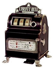 | A gép 1907-es változata, hozta meg az igazi sikert. Ez már öntöttvas házat kapott és a Liberty Bell (szabadság harangja) nevet kapta, mivel ez a kombináció (3 harang) fizette a legtöbb nyereményt, 50 centet. Ez a gép gyakorlatilag minden félkarú rabló őse. | |